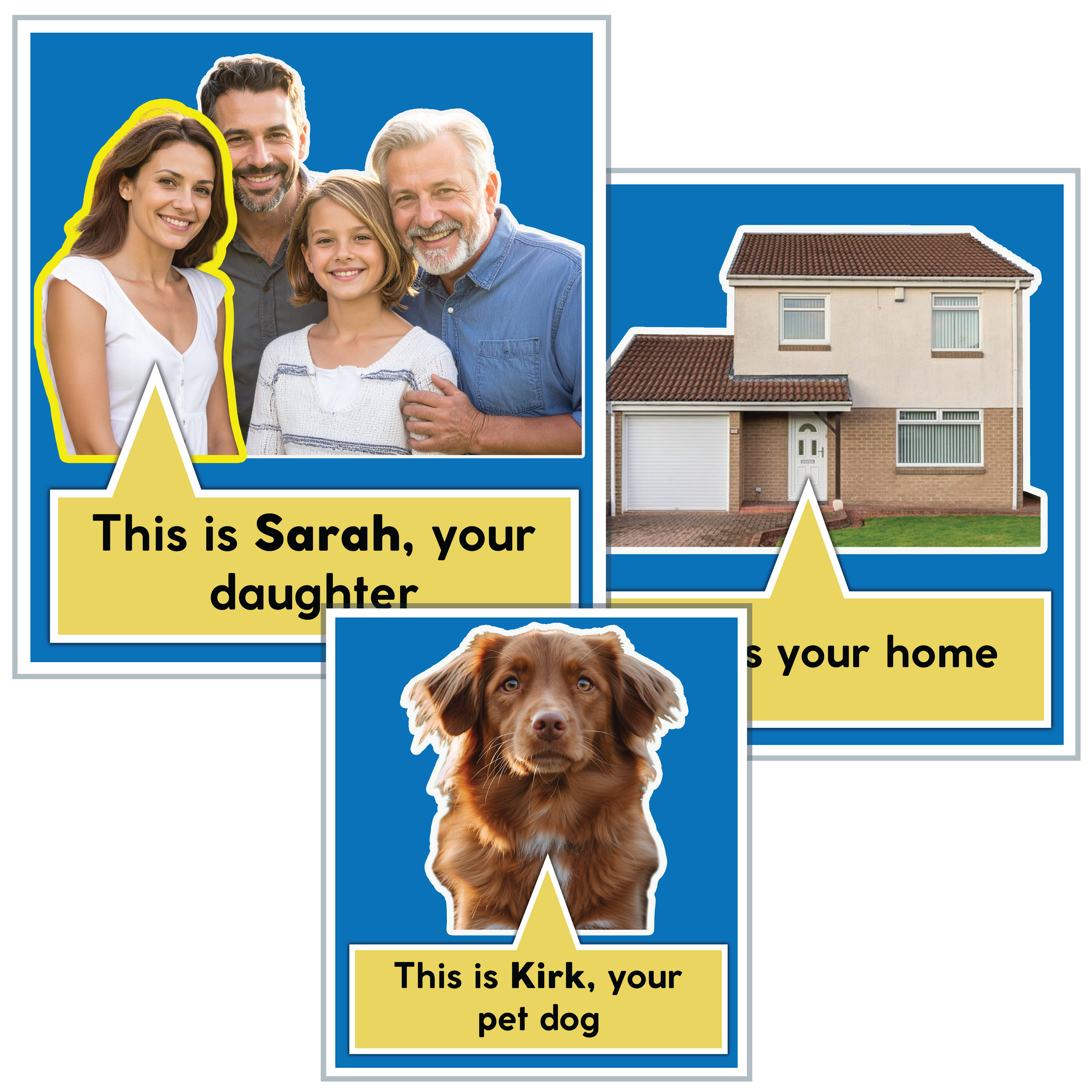 Personal memory cards and books. Family photos with names written clearly underneath (e.g., “This is Sarah, your daughter”). Favourite place, walk or holiday.