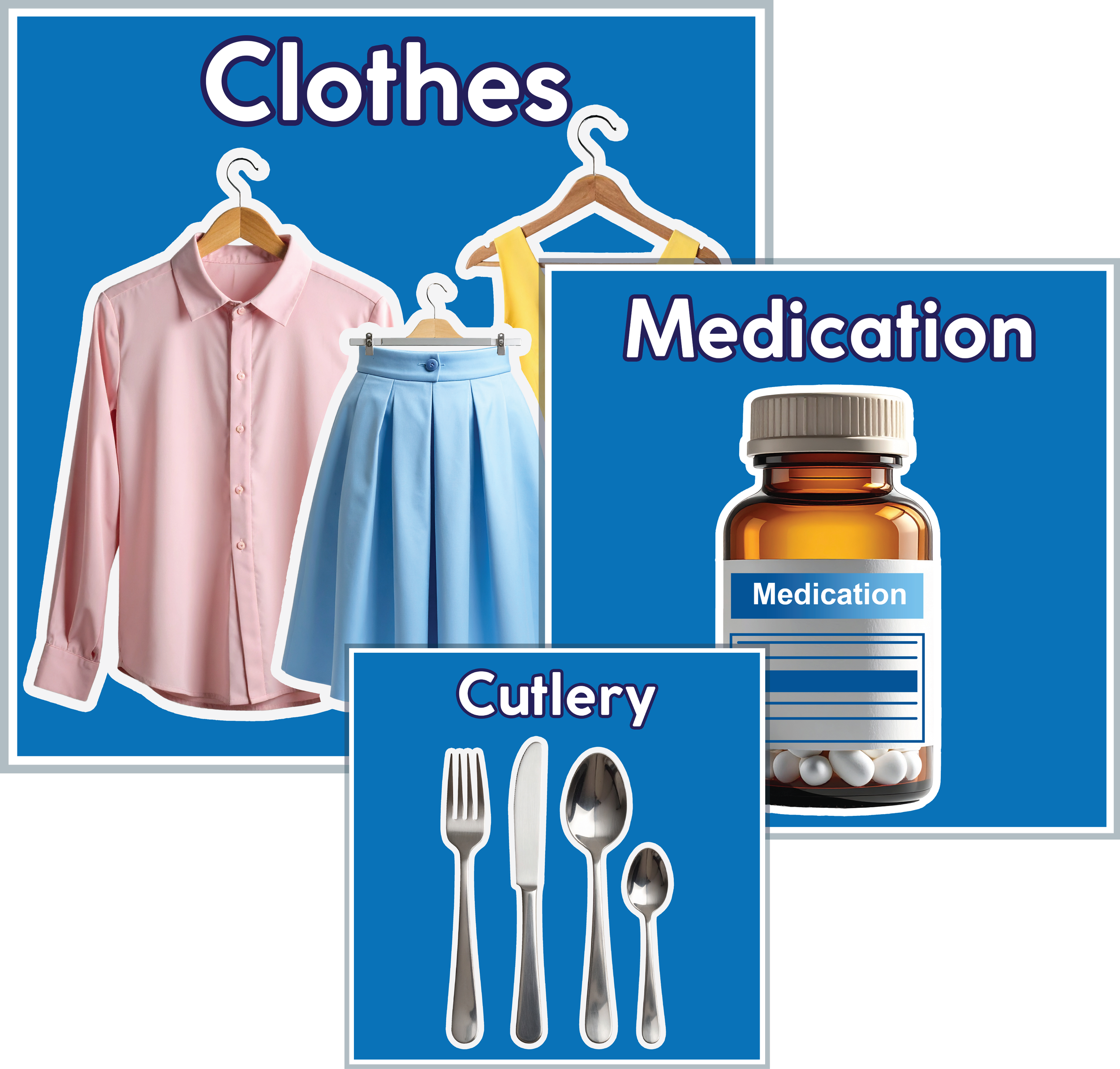 These labels may include photos or symbols alongside easy words to clearly indicate what is inside or what the space is used for, such as bedrooms, kitchens, plates, clothing, food, or toilets. This approach helps improve understanding, promotes independence, and reduces confusion and anxiety.